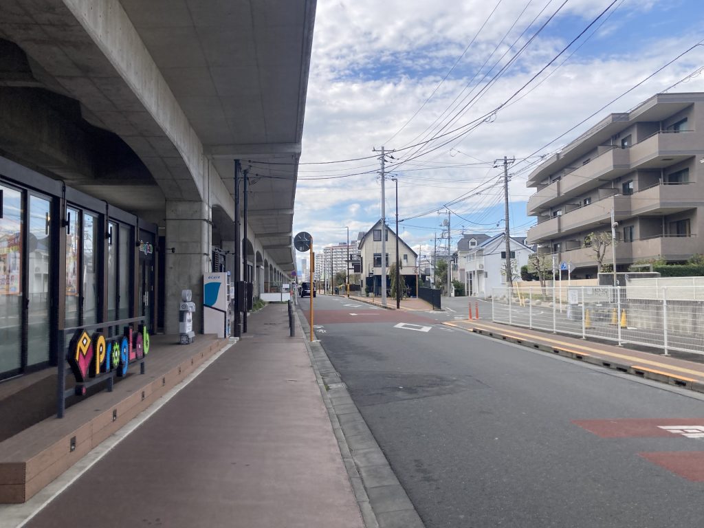 ②くにっこバスのバス停「高架下駐輪場前」を通りすぎ少し歩くと、左手にプログラミング教室と体操室が見え、道が二手に分かれています。右側の曲がった道に入っていきます。