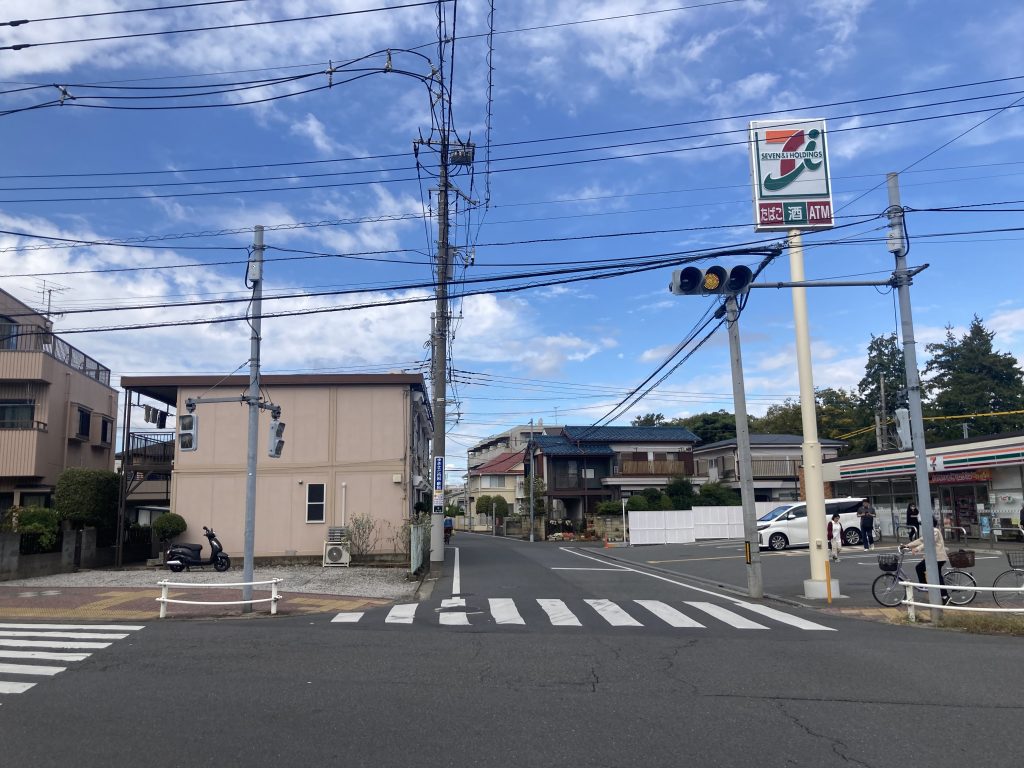 ③そのまま直進すると、横断歩道を渡った右手にセブンイレブンがあります。左手2軒目に見えるのが、アトリエくもわのビルになります。裏にまわると階段があるので、上っていただくと2階に教室があります。